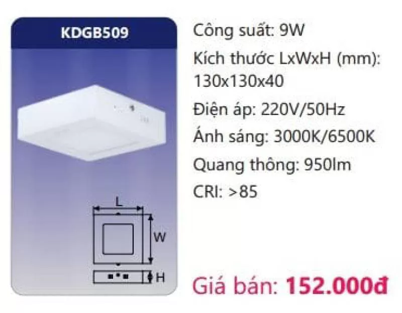 Công suất: 9W Kích thước LxWxH (mm): 130 x 130 x 40 Điện áp: 220V/50Hz Ánh sáng: 3000K/6500K Quang thông: 950lm CRI: >85