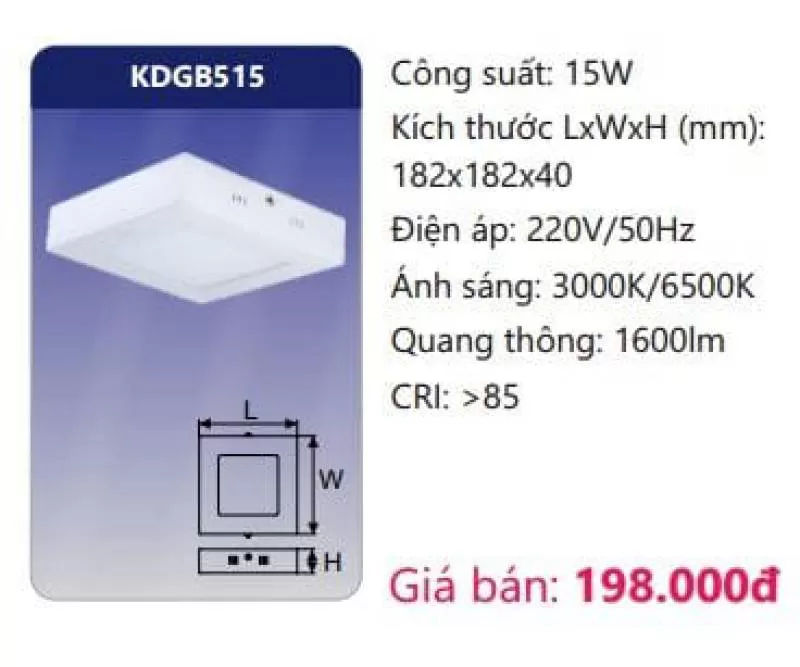 Công suất: 15W Kích thước LxWxH (mm): 182 x 182 x 40 Điện áp: 220V/50Hz Ánh sáng: 3000K/6500K Quang thông: 1600lm CRI: >85