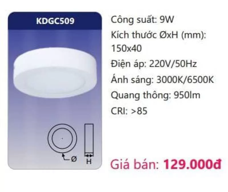 Công suất: 9W Kích thước ØxH (mm): 150 x 40 Điện áp: 220V/50Hz Ánh sáng: 3000K/6500K Quang thông: 950lm CRI: >85
