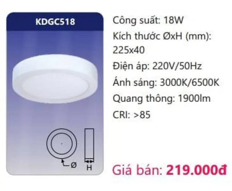 Công suất: 18W Kích thước ØxH (mm): 225 x 40 Điện áp: 220V/50Hz Ánh sáng: 3000K/6500K Quang thông: 1900lm CRI: >85