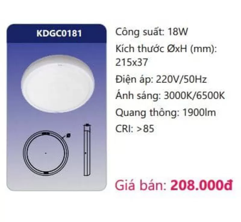 Công suất: 18W Kích thước ØxH (mm): 215 x 37 Điện áp: 220V/50Hz Ánh sáng: 3000K/6500K Quang thông: 1900lm CRI: >85