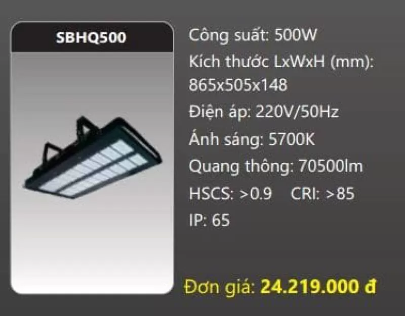 Đèn LED pha bảng SBHQ500 Công suất: 500W Kích thước LxWxH (mm): 865 x 505 x 148 Điện áp: 220V/50Hz Ánh sáng: 5700K Quang thông: 70500lm HSCS: >0.9 CRI: >85 IP: 65