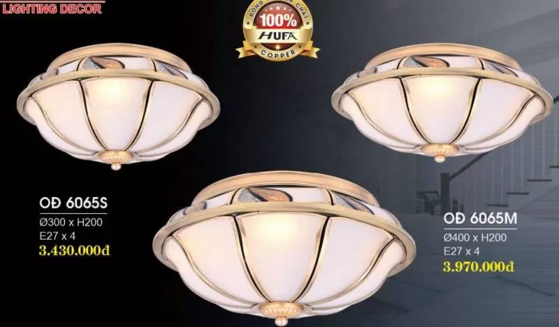 Đèn ốp đồng OĐ 6065M HUFA Thương Hiệu: Hufa, Kích thước: Ø400 x H200, Sử dụng đèn đuôi E27 x 4 bóng, Bảo hành 12 tháng.
