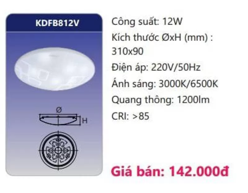 Công suất: 12W Kích thước ØxH (mm): 310 x 90 Điện áp: 220V/50Hz Ánh sáng: 3000K/6500K Quang thông: 1200lm CRI: >85