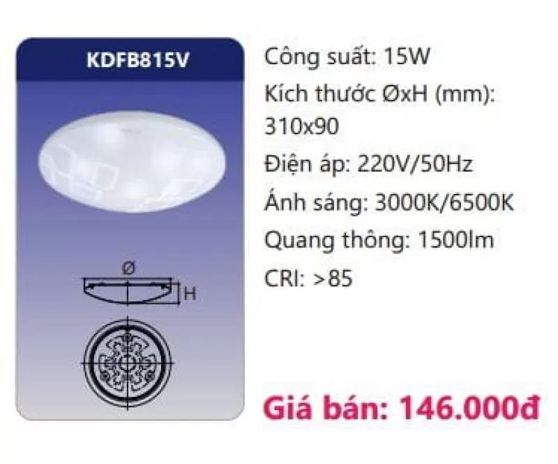 Công suất: 15W Kích thước ØxH (mm): 310 x 90 Điện áp: 220V/50Hz Ánh sáng: 3000K/6500K Quang thông: 1500lm CRI: >85