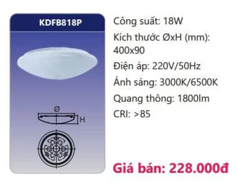 Công suất: 18W Kích thước ØxH (mm): 400 x 90 Điện áp: 220V/50Hz Ánh sáng: 3000K/6500K Quang thông: 1800lm CRI: >85