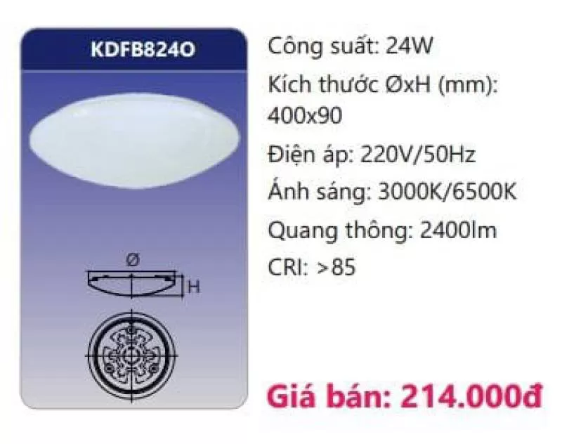 Công suất: 24W Kích thước ØxH (mm): 400 x 90 Điện áp: 220V/50Hz Ánh sáng: 3000K/6500K Quang thông: 2400lm CRI: >85