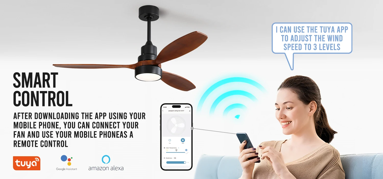 One of the key advantages of our Smart Ceiling Fan is its ability to be controlled seamlessly through Bluetooth and Wi-Fi connectivity. With just a few taps on your smartphone or voice commands, you can effortlessly adjust the fan's speed, direction,and lighting to suit your preferences. Not only does our Smart Ceiling Fan provide superior functionality, but it also offers a personalized smart solution tailored to your needs like TUYA, Google Assistant, and Amazon Alexa, you can integrate the fan seamlessly into your existing smart home ecosystem. This means you can effortlessly control the fan using voice commands or through the convenience of a single app.