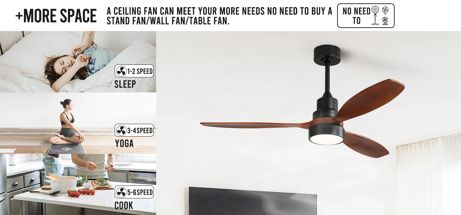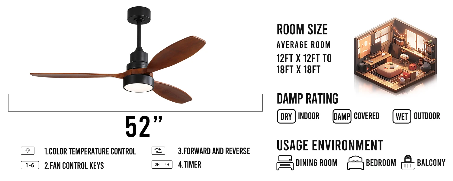 This 52-inch wood ceiling fan is perfect for enhancing the ambiance in various spaces, whether it's your cozy kitchen, relaxing bedroom, inviting living room, elegant dining area, refreshing patio, or bustling common areas.