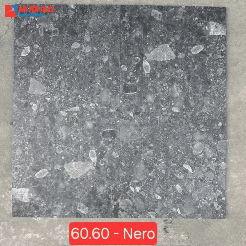 Gạch Terrazzo Nero – Gạch Tezzarro Ấn Độ 60x60 cao cấp, tông màu ghi đậm, bề mặt men mát. Mua ngay tại Gạch Hải Yến để nhận giá ưu đãi hấp dẫn!