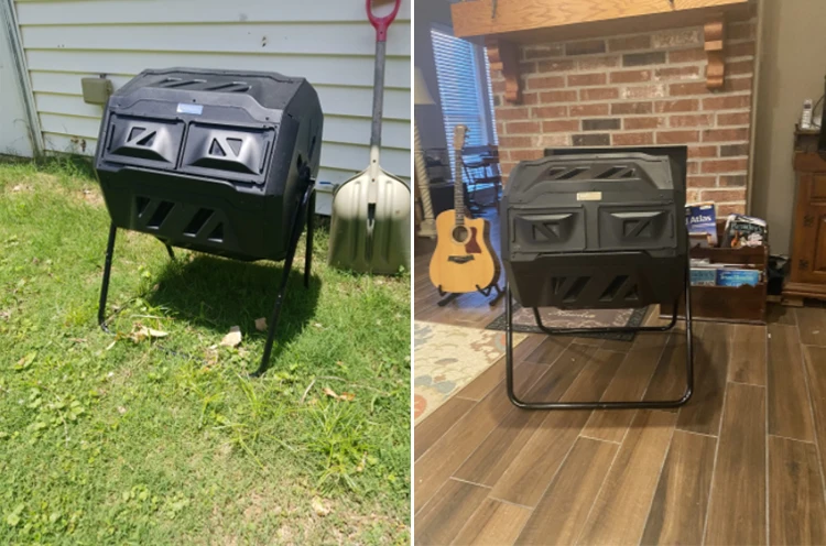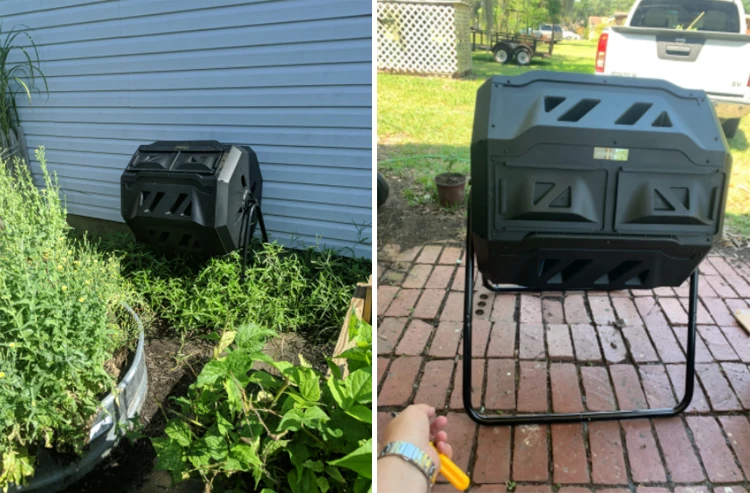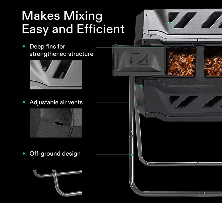 Twin Chambers: Designed with 2 chambers, the tumbling composter allows you to compost in batches; One side "cooks" while you add fresh organic material to the other, allowing for an efficient | ||||||