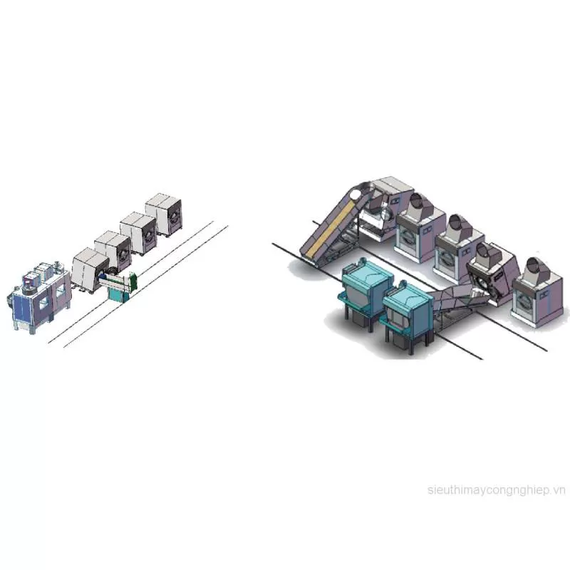 - Hệ thống bán tự động, máy giặt vắt nghiêng về phía trước + băng tải con thoi + máy sấy chuyển