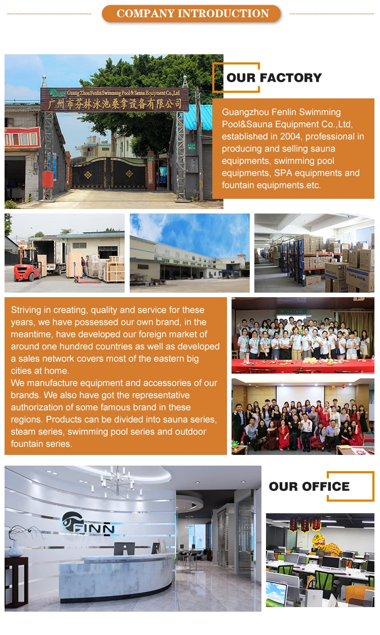 OurGuangzhouFenlinSaunaEquipmentCo.,Ltd.Has9yearsswimmingpoolequipmentexperience,wasestablishedinthelatetwentiethcentury,itisarenownedenterprisededicatedtothedesign,research,development,productionandmarketingofseriesofthesaunaequipments,swimmingpool,healthspaequipment,outdoorfurniture,fountainandrelatedproducts.Wehadindependentbrand.