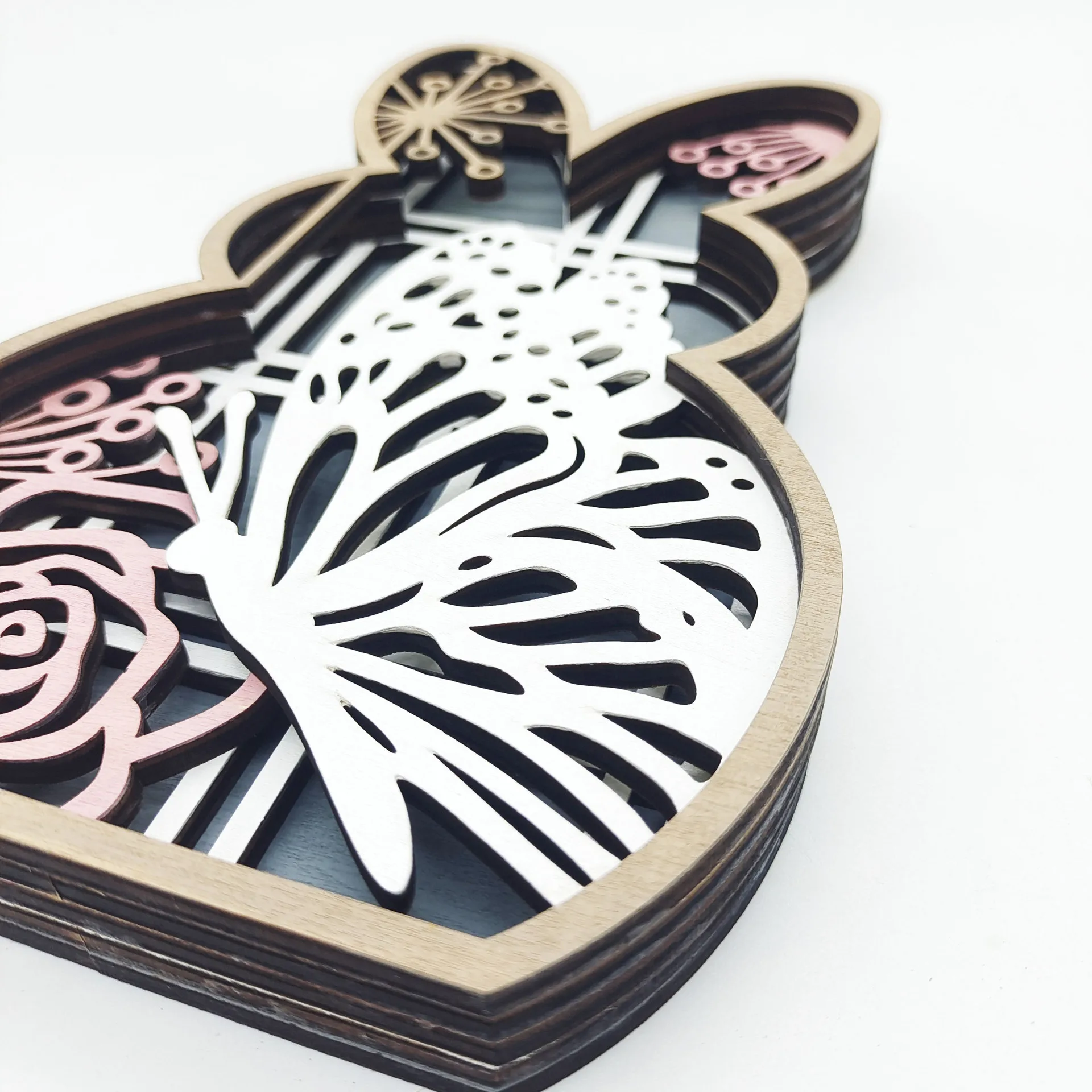Home Decoration Rabbit Butterfly Multi Layer Carved Animal Wooden Crafts Easter Bunny Figurines