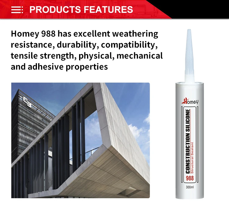 Homey 988 is a one part,neutral cure, versatile, high modulus architectural grade silicone sealant. It is for general building constructions as well as structural Glazing Adhesive uses.