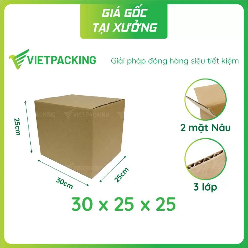 Hộp carton 30x25x25 giao hàng COD, giá tốt tại xưởng. Sản phẩm của Vietpacking với chất lượng gia công cực kỳ cao, đáp ứng mọi tiêu chuẩn của khách hàng.Shipping/Vận chuyển