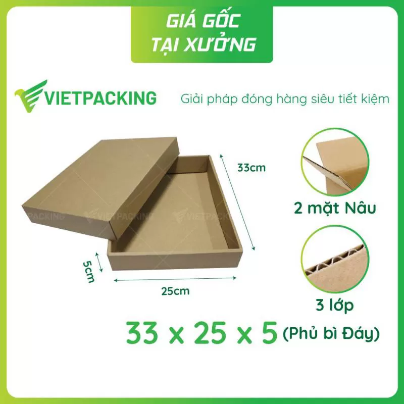 Hộp carton âm dương nắp rời 33x25x5 có chất liệu giấy tốt, hàng hóa được bảo vệ an toàn trong quá trình vận chuyển, tăng trải nghiệm tốt của khách hàng đối