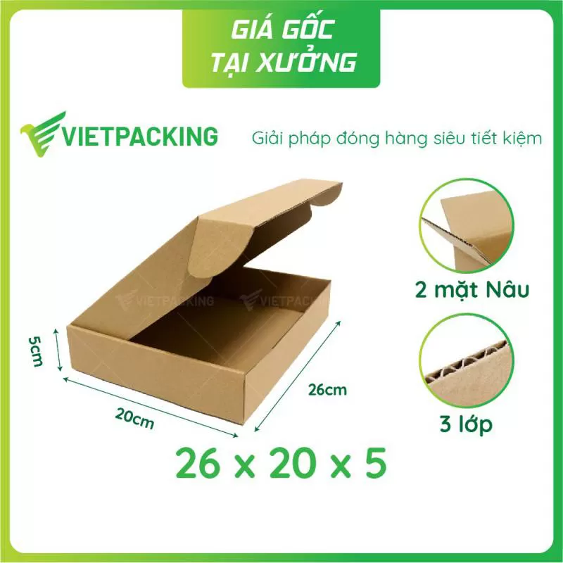 Hộp carton nắp gài 26x20x5 giá tốt chất lượng, in logo. Sản phẩm của Vietpacking với chất lượng gia công cao, đáp ứng mọi tiêu chuẩn của khách hàng.