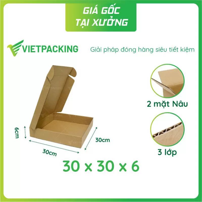 Hộp carton nắp gài 30x30x6 có 3 lớp mang đến cứng cáp, chịu lực tốt, độ dày tương đối.
