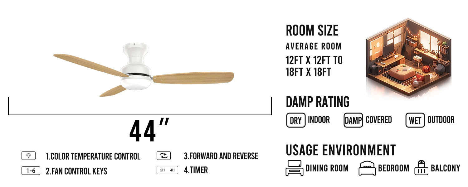 This ceiling fan is very easy to assembly, All can be easily controlled by the remote, this low profile ceiling fan features 6 speeds, timer function, forward and reverse rotation, providing you a comfortable and joyful living environment in four season.