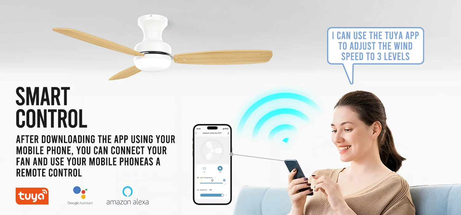 One of the key advantages of our Smart Ceiling Fan is its ability to be controlled seamlessly through Bluetooth and Wi-Fi connectivity. With just a few taps on your smartphone or voice commands, you can effortlessly adjust the fan's speed, direction,and lighting to suit your preferences. Not only does our Smart Ceiling Fan provide superior functionality, but it also offers a personalized smart solution tailored to your needs like TUYA, Google Assistant, and Amazon Alexa, you can integrate the fan seamlessly into your existing smart home ecosystem. This means you can effortlessly control the fan using voice commands or through the convenience of a single app.