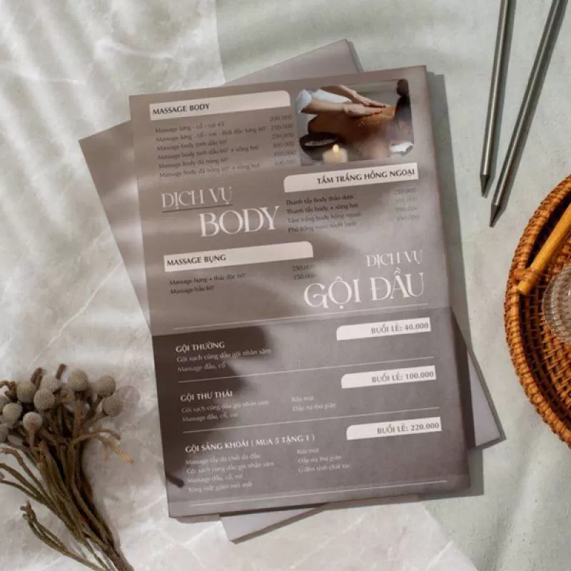 In menu spa, menu nail, menu beauty đẹp mắt, sang trọng và chuyên nghiệp tại Hà Nội. In Hoa Long cung cấp menu dịch vụ spa giá rẻ, hotline 0903.400.469.Shipping/Vận chuyển