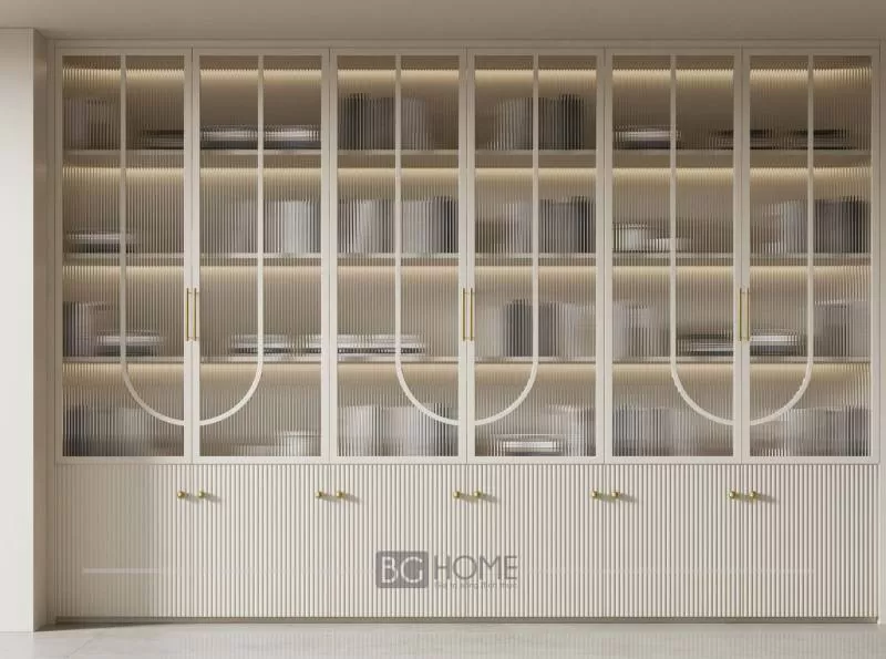 3. Tủ trưng bày phòng khách với chất liệu nhôm kính