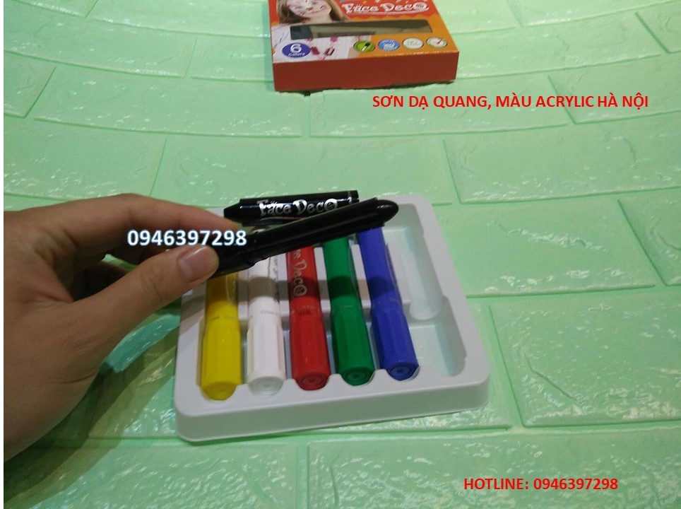 Một hộp màu gồm 6 màu: trắng, vàng, đỏ, xanh lá, xanh dương và đen. Giá bán 220.000đ/hộp.