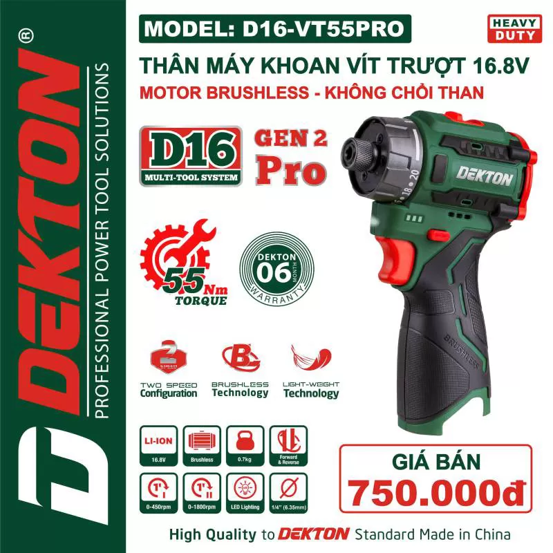 Máy khoan vít trượt Dekton D16-VT55PRO là dòng sản phẩm đáng đầu tư cho mọi đối tượng từ thợ kỹ thuật đến người dùng gia đình. Máy khoan pin mức giá chỉ 750.000 đồng cho một thân máy không chổi than, lực siết mạnh, thiết kế nhẹ gọn và đầy đủ tính năng hỗ trợ đây thực sự là lựa chọn thông minh và tiết kiệm.
