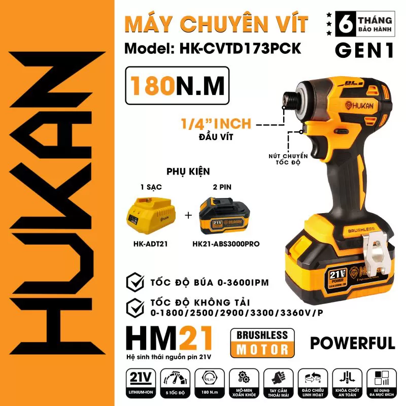 Mã sản phẩm: HK-CVTD173PCK Thân máy + 2 Pin 3.0Ah ABS Pro + 1 sạc ADT21 + 1 hộp nhựa Điện áp pin: 21V Lực siết: 180Nm Dung lượng pin: 3000mAh Động cơ không chổi than Tốc độ búa :0-3600 IPM Tốc độ không tải: 0-1800/2500/2900/3300-3360 r/phút Đầu lục giác: 1/4″(6.35mm)