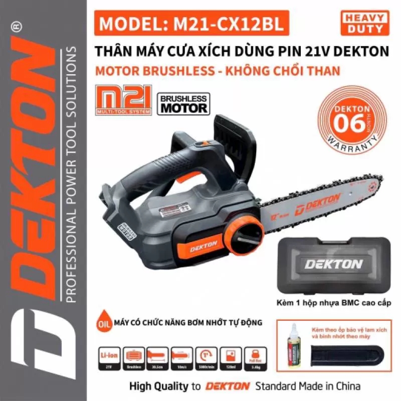 Máy cưa xích dùng pin Dekton M21-CX12BL là dòng sản phẩm cao cấp thuộc hệ sinh thái M21 Multi-Tool System, được thiết kế cho nhu cầu cắt gỗ, tỉa cây và xử lý vật liệu nhanh chóng, an toàn.Sở hữu động cơ không chổi than (Brushless Motor) và thân máy nhôm nguyên khối, sản phẩm mang lại độ bền vượt trội, lực cắt mạnh mẽ và hiệu suất ổn định. Máy cưa xích dùng pin 21V Dekton M21-Cx12BL có hộpShipping/Vận chuyển