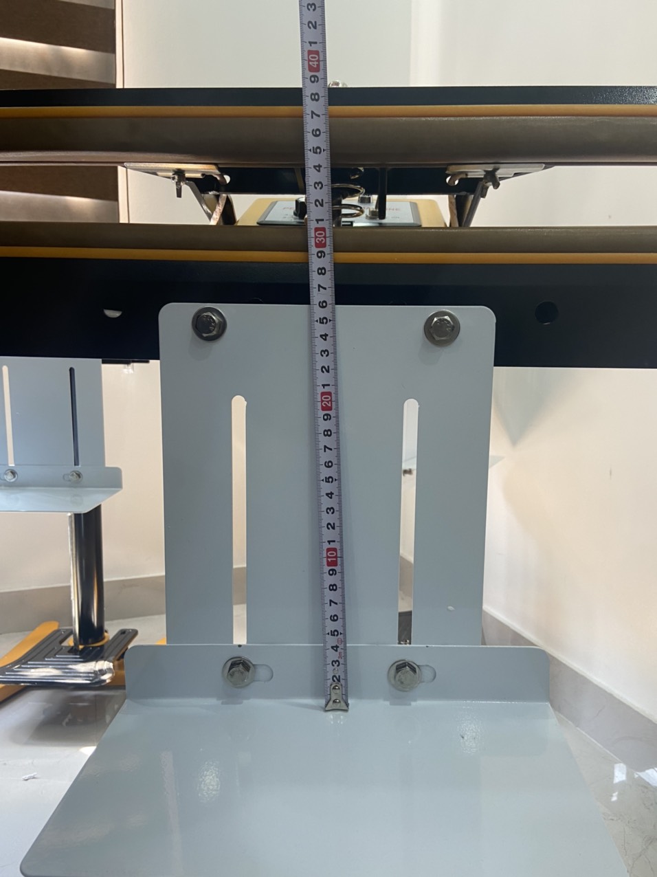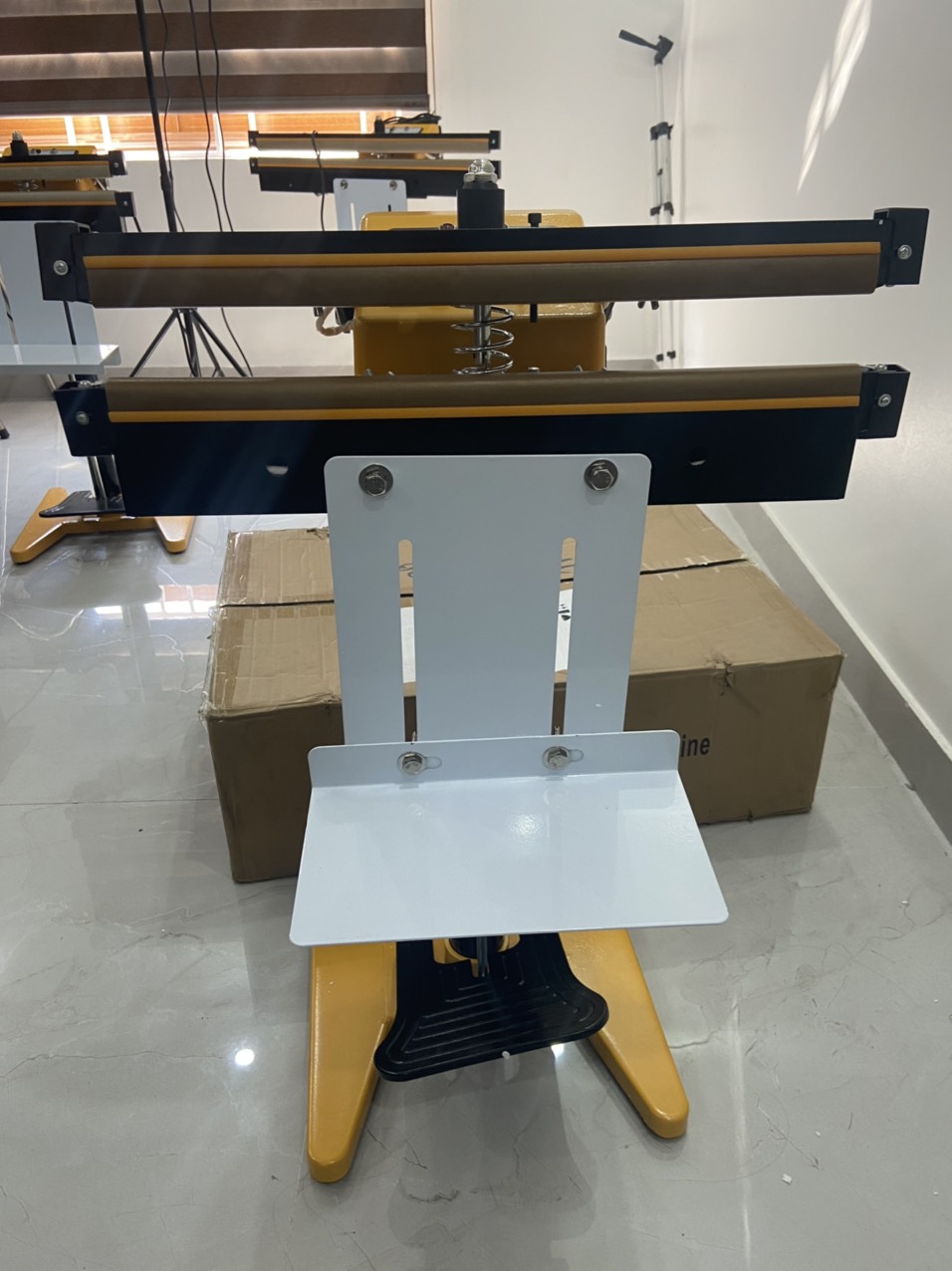 Bàn dập chân:Đây là một trong những bộ phận quan trọng nhất của máy. Thanh hàn được kết nối với bàn dập chân để người dùng dễ dàng điều khiển quá trình hàn túi. Người dùng tiến hành đưa miệng túi vào giữa thanh hàn trên và thanh hàn dưới. Sau đó dùng chân đạp lên bàn dập chân. Hai thanh hàn được kéo chặt lại với nhau và ép, dán các miệng túi.