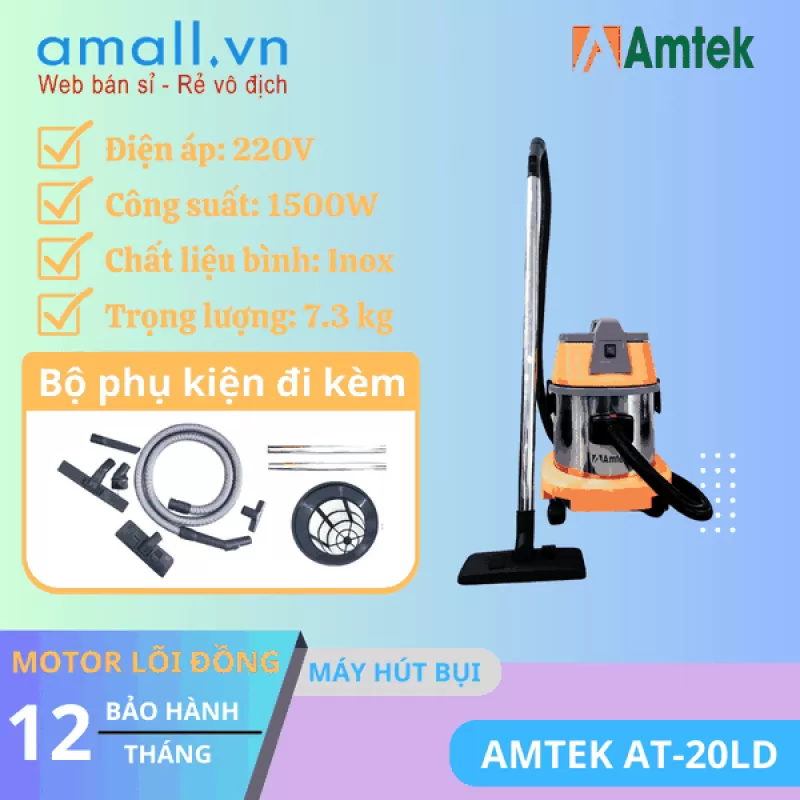 Máy hút bụi khô ướt Amtek AT-20LD với công suất mạnh mẽ, dung tích 20L, thiết kế nhỏ gọn, dễ dàng hút sạch bụi bẩn và chất lỏng, phù hợp cho gia đình và văn phòng.