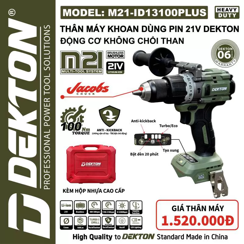 Máy khoan pin Dekton M21-ID13100PLUS với động cơ không chổi than và pin dung lượng cao, mang lại hiệu suất vượt trội và độ bền caoShipping/Vận chuyển