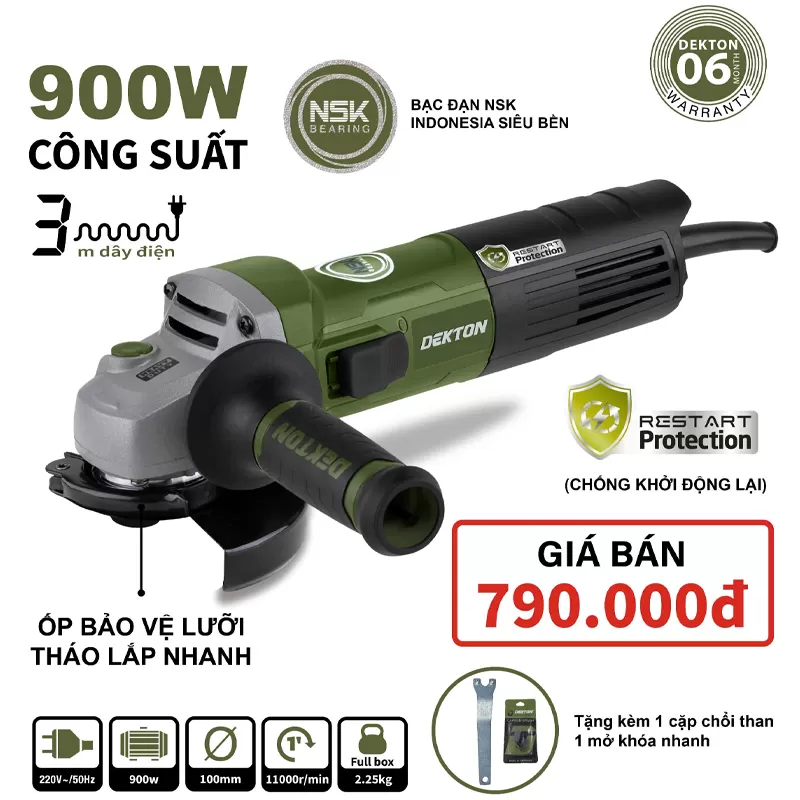 Điểm nổi bật của DK-AG900XR là trang bị bạc đạn NSK Indonesia siêu bền, công tắc trượt tiện lợi, và đặc biệt là hệ thống chống khởi động lại Restart Protection – giúp đảm bảo an toàn khi sử dụng trong điều kiện điện áp không ổn định