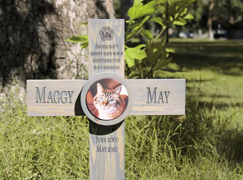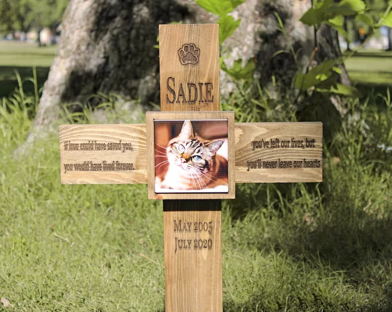 This beautiful memorial cross is the perfect way to remember your departed pet. Handcrafted with solid wood, each cross is engraved with your personalized messages. We can also include a small cat or dog pawprint or heart symbol if requested.