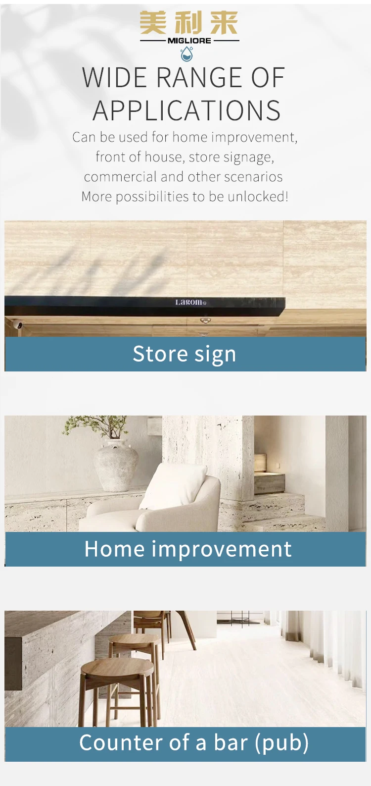 Application: Hotel,Villa,Apartment,Office Building,Hospital,School,Mall,Supermarket,Farmhouse,Courtyard,Kitchen,Bathroom,Home Office,Living Room,Bedroom,Home Bar,Basement,Garage and Shed,Gym,Room,Wall Decoration