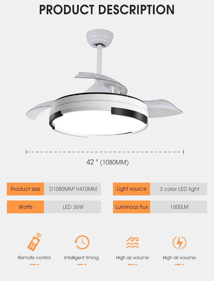 Bluetooth Retractable Ceilling Fan 42 Inch 3 ABS Transparency Blade Ceilling Fan With Light and Remote Control