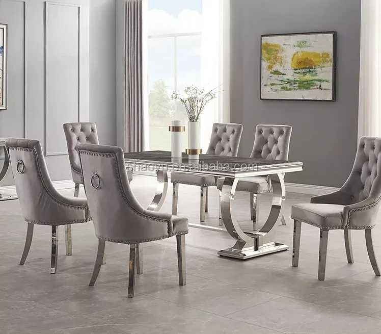 Modern Furniture Kitchen Dinning Table and 6 Chair Luxury Restaurant Metal Stainless Steel Marble Dining Room Sets Dining Tables
