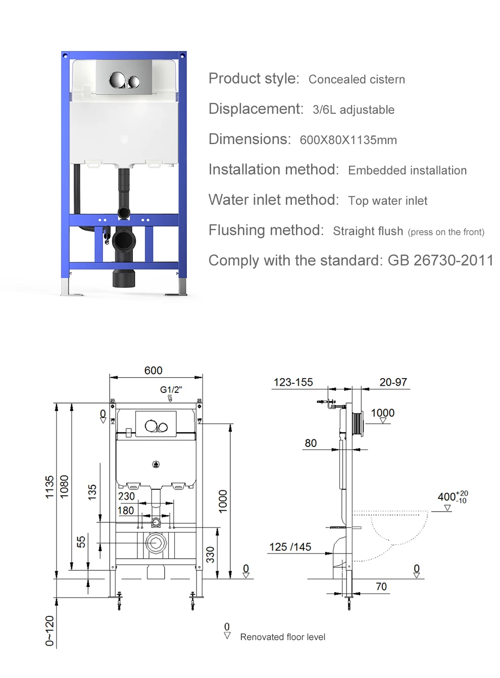 Water pressure: 0.12-0.8Mpa | P-trap:185mm |