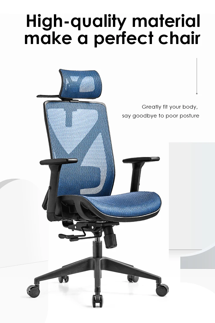 Description  | 1) High back ergonomic mesh office chair with adj. 2D headrest with fabric padded & clother hanger 2) Full backrest is height adjustable(6 locks); Nylon mesh back with white nylon back frame + height adjustable 2D lumbar support in height & depth with foam padded; 3) PU/Fabric padded seat with injection foam inside + plastic seat bottom cover 4) 3D adjustable armrest with soft PU armpad 5) BIFMA passed CLASS 4 bchrome gaslift 6) Muti-functional mechanism with back reclining and locking at 4 positions function ,with seat sliding(+4.5CM) 7) 350mm aluminum base & BIFMA passed 60mm PU nylon castors  | |