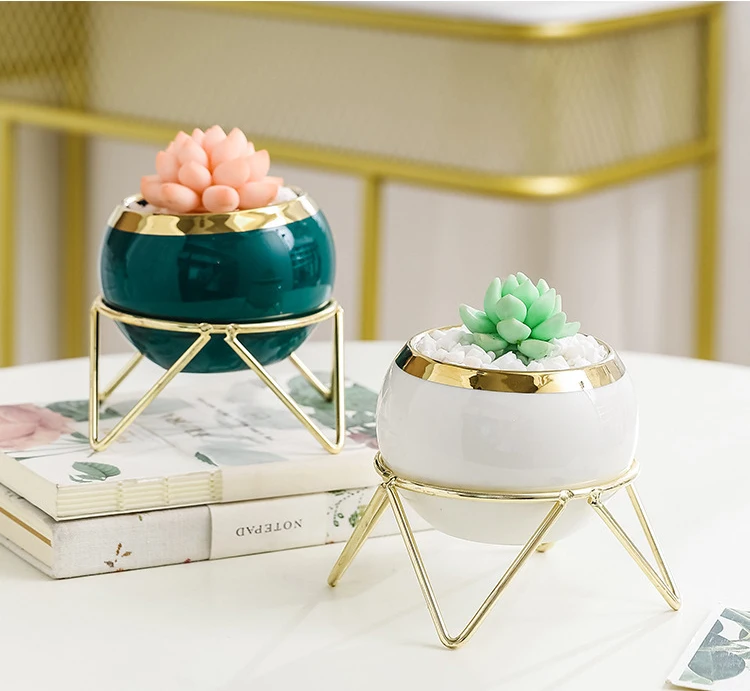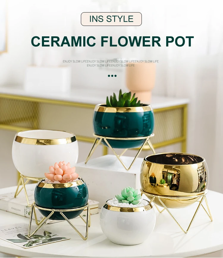 Morden Luxury Combination Decoration Succulents Ceram Flower Plant Pots With Metal Stand