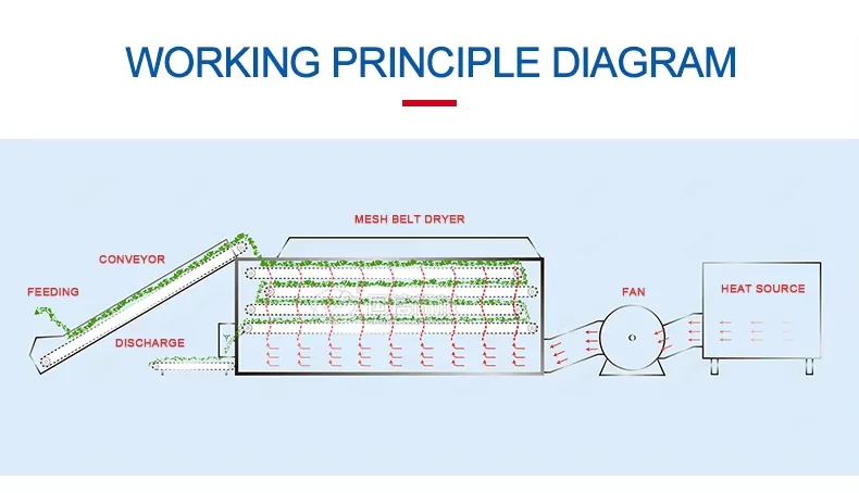 Working Principle of New Design Vegetable Lettuce Cabbage Mesh Belt Drying Equipment Garlic Slice Pepper Drying Machine.