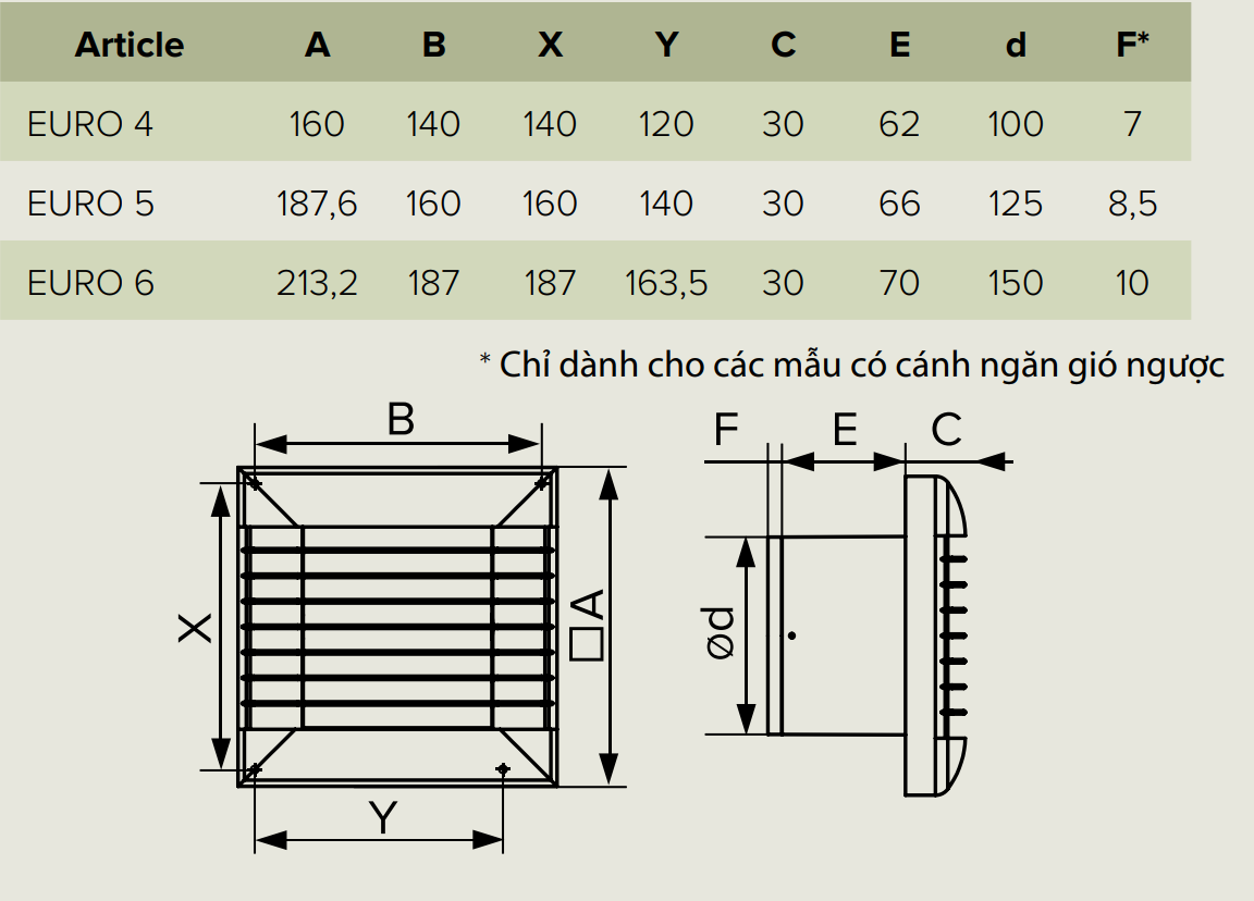- Euro A được bổ sung với bộ truyền động nhiệt đảm bảo việc đóng và mở cửa chớp tự động trơn tru (trong 40 giây sau khi bật/tắt quạt) ngăn gió ngược.