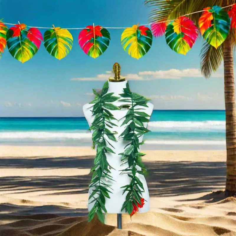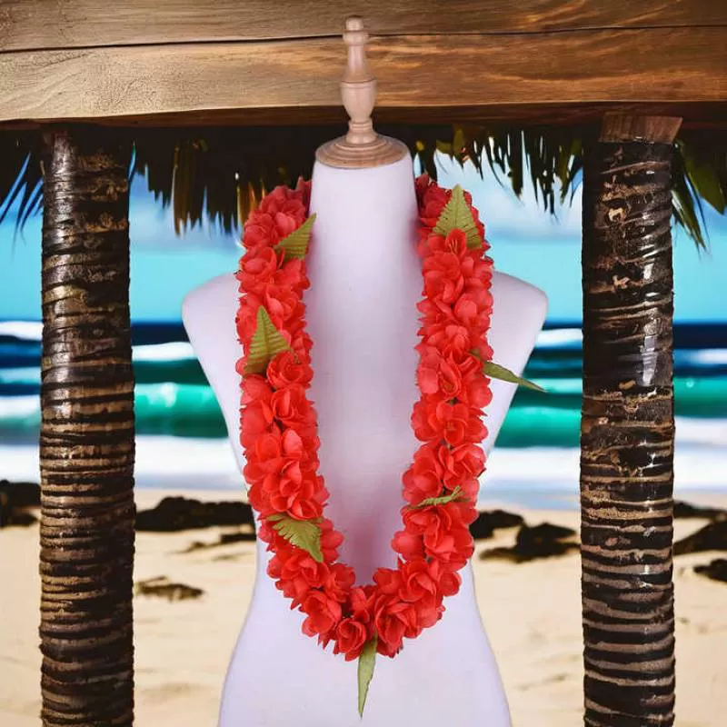 Father's Day Artificial Silk Dark Green Single Maile Leaf Lei w Hibiscus Flower Hawaii Party Wedding Celebration