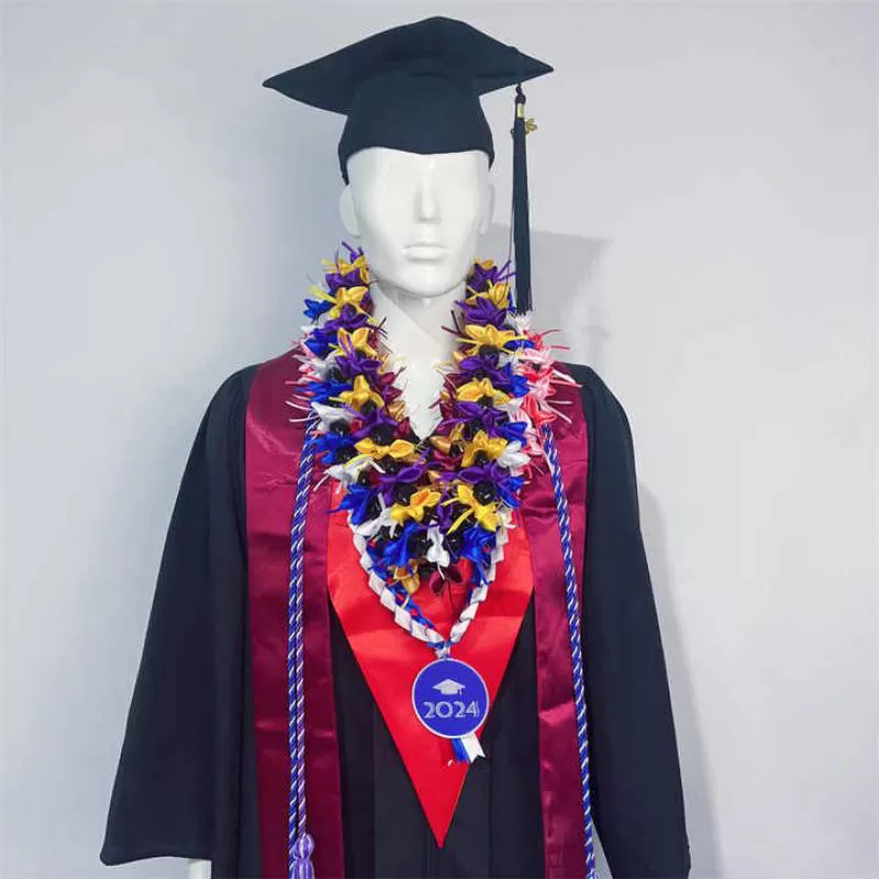 School Color Graduation Ribbon Lei with Kukui Nuts Flower Ribbon Lei Hawaiian Ribbon Lei