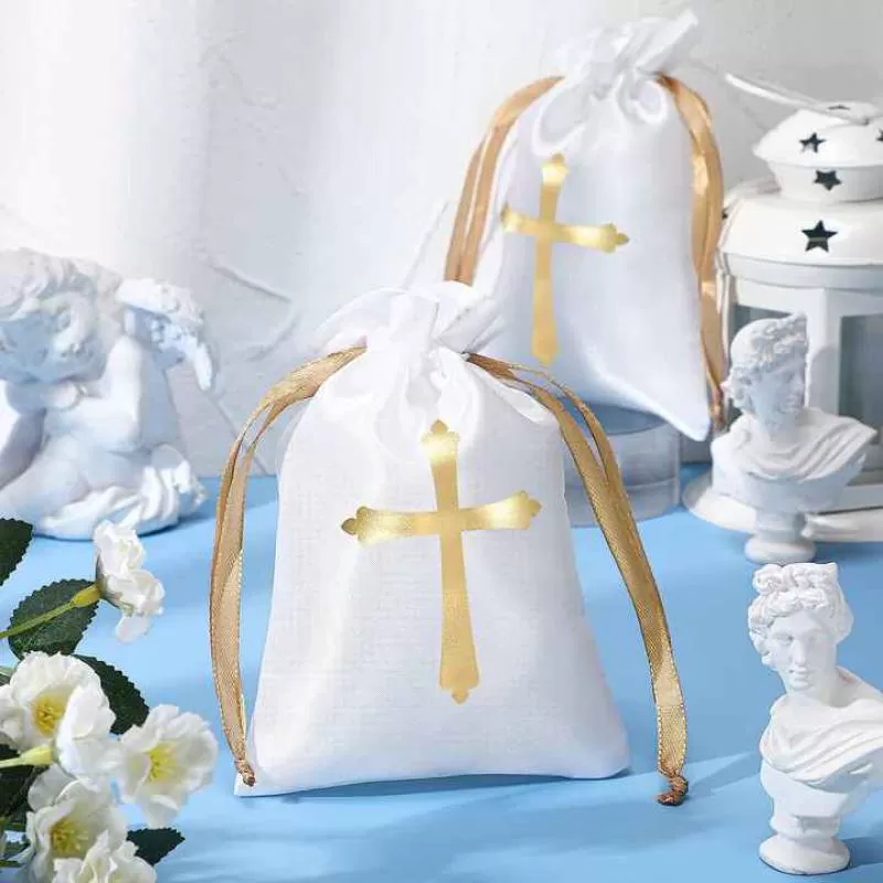 Gold Cross Satin Bags With Drawstring Religious Party Favor Gift Bags White Gift Bag Jewelry Pouches