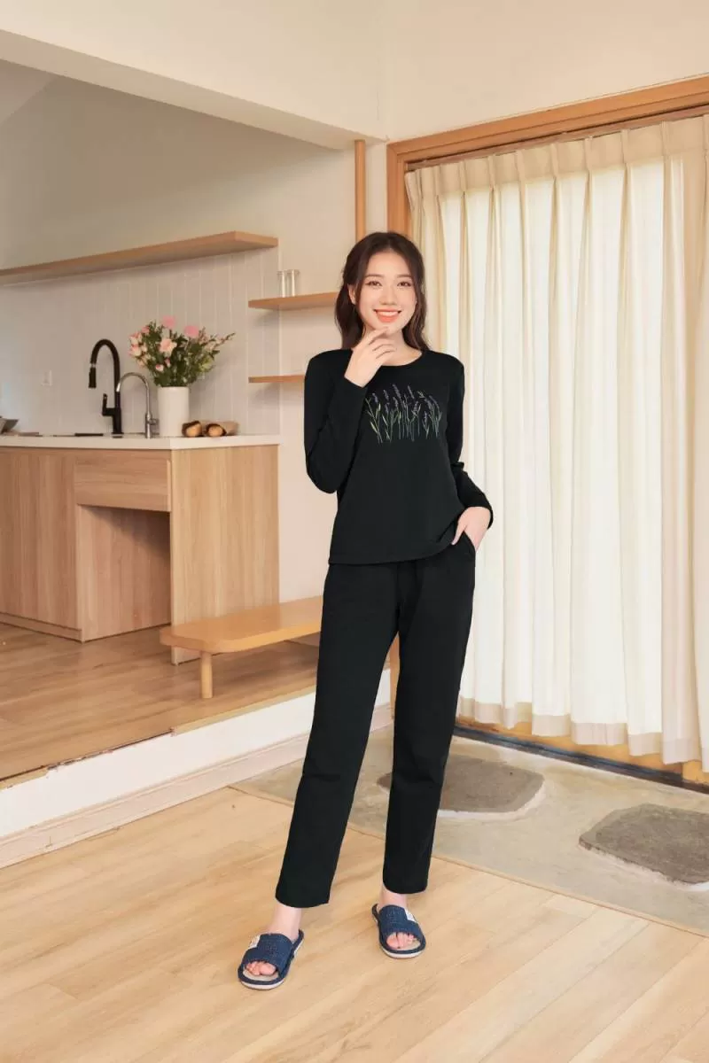 Bộ nỉ thu đông nữ Cardina cao cấp chất nỉ da cá họa tiết hoa thêu dài tay dáng quần suông