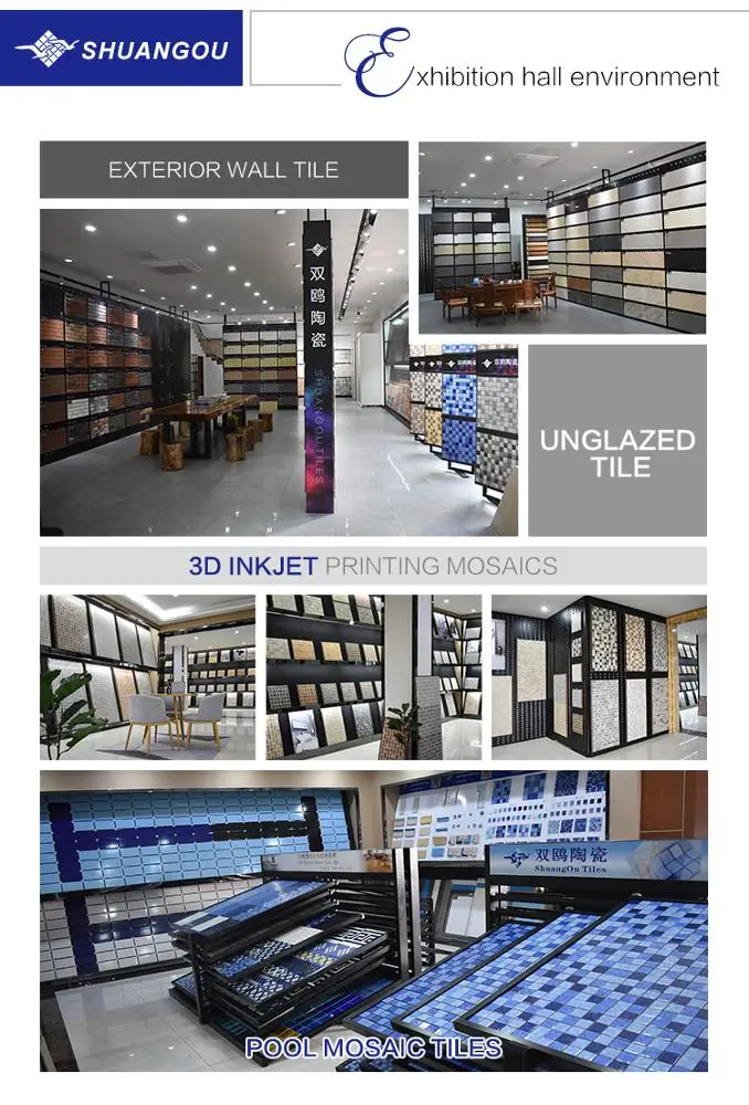 With years of experience in ceramic mosaic service, we Shuangou now offer a complete line of the latest and most fashionable designs of swimming pool mosaics, Spa & Fountain Mosaics, and mosaics for kitchen & bathroom decoration. Our new 3D Inkjet Printing Ceramic Floor and Wall Tile created and presented by Shuang Ou Tiles features beautiful color variations and an easy, rustic appearance to personalize your space. 100% Customization is our biggest advantage. We can make any pattern designs upon customer’s requirements based on much smaller quantity of Minimum Order Quantity compared with other tiles.