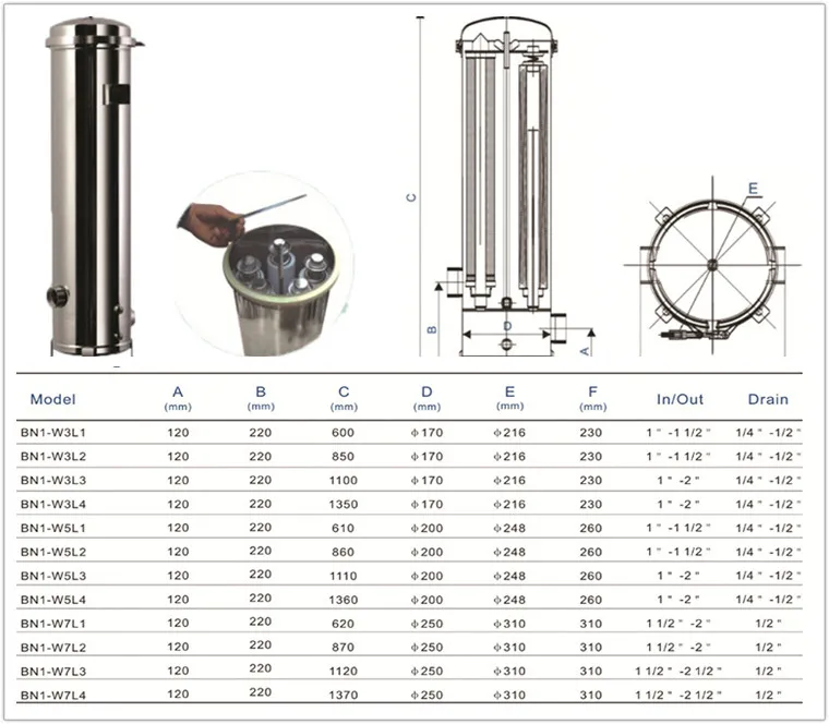 Working pressure: 0.6 / 1.0 / 1.6Mpa Body Material: Stainless steel (SUS304, SUS304L, SUS316, SUS316L). Operating temperature: 5 ~ 40 ℃ (exceed 60 ℃ to be informed) Design temperature: 5 ℃ -100 ℃ Replace the pressure: 0.05Mpa-0.07MPA Filter interface: flat compression, plug-in Cylinder and base connection mode: quick opening, flanged Filtration accuracy: 1μm ~ 100μm Cartridge Quantity: 1 core to 180 cores Filter Length: 10 "~ 40" Seal type: O-ring or flat washer Seal Material: PTFE, rubber. Outside treating :matte jet beads, mirror electrolytic polishing. Sealing material: nitrile rubber, silicone, Viton, standard configuration for the silicone seal. Interface Type: GB, HG, DIN, ANSI, JIS standard flanges, dental mouth, clamps and so on. Flange Standard: GB, HG, SH, HGJ, JB, ANSL, JIS and other standards. (User-specified, please indicate the pressure level) Manufacturing, testing standard: GB150 standard, or user-specified criteria.